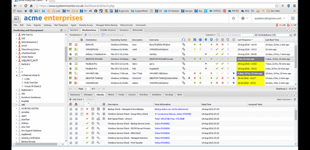 As the customer base gradually grew, I knew that this was not feasible and something needed to be done about it. I think I started with the Nagios monitoring system, then went to Zabbix, I was testing Centeron for a while, and I have finally used Icinga. It was not as complex as the system we have now, but it was a significant shift forward. Finally, with one glance at the web browser, I saw that computers, servers, and the network were okay (services running, backups running, the network available, computers antivirus protected…). What I used to do earlier (for example, to check the backups) I now had a live status update with “no” work.