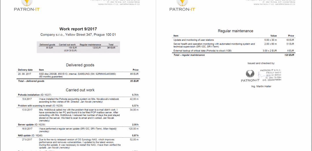- We attach a work report to each invoice (sample PDF work report for inspiration) – thanks to which the customer knows exactly what he is paying for. From the very beginning, the work report was simple. It contained records of “who”, “what”, “when”, and “how long” has been dealing with. Now they also include a list of the supplied HW / SW and regular maintenance items – something that happens throughout the month and does not relate to a specific time (e.g. server monitoring).